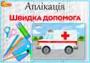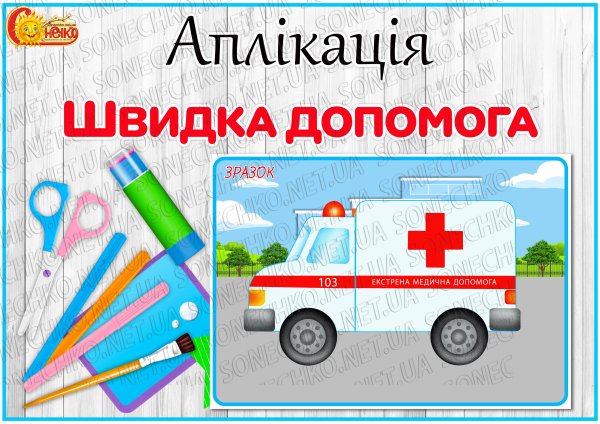 Мета: закріпити знання малят про транспорт спеціального призначення, а саме — швидку медичну допомогу; вчити дітей вирізати елементи для створення автомобіля, покроково приклеювати їх; закріпити правила безпеки під час різання ножицями, уміння охайно наклеювати форми; розвивати творчі здібності, уяву, дрібну моторику рук; виховувати охайність у роботі, повагу до працівників швидної допомоги.