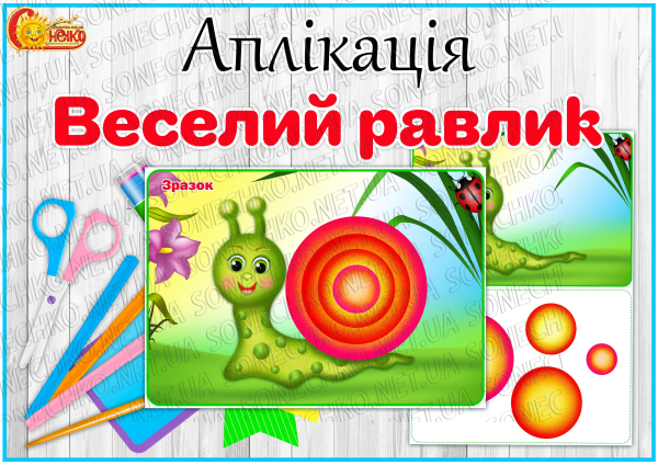 Мета: збагатити знання малят про равликів, їх спосіб життя; вчити дітей вирізати кола різної величини; нагадати важливість плавного координування руху ножиць та вільної руки; закріпити правила безпеки під час різання ножицями, уміння покроково наклеювати форми; розвивати увагу, фантазію, зорово-моторну координацію; виховувати охайність, дбайливе ставлення до живої та неживої природи.