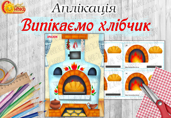 Мета: дати дітям знання про хліб, як цінний продукт харчування, святиню українського народу; запропонувати малятам спекти домашній хліб у печі (виготовити аплікацію); вчити вирізати елементи для створення цілісного зображення; закріпити правила роботи з клеєм, безпечного поводження з ножицями; розвивати увагу, творчі здібності, дрібну моторику рук; виховувати дбайливе, бережливе ставлення до хліба.