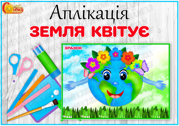 Мета: поглибити знання малят про планету, природу та вплив людини на неї; вчити дітей вирізати елементи для створення планети Земля у віночку з квітів, покроково приклеювати їх; закріпити правила безпеки під час різання ножицями, уміння охайно наклеювати форми; розвивати окомір, творчу уяву, дрібну моторику рук; виховувати бажання зберегти нашу планету Земля.