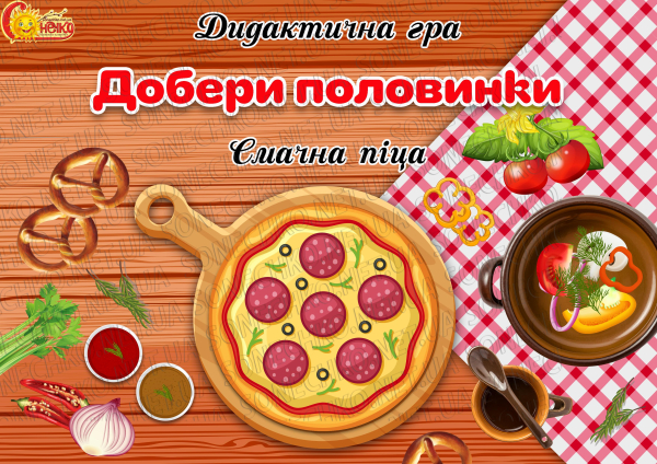 Мета: вчити дітей підбирати відповідні половинки піц, звертаючи увагу на інгредієнти, які використані для їх приготування; формувати уміння придумувати назви для піци; розвивати навички спостережливості, уміння порівнювати, аналізувати та концентруватися на деталях; виховувати акуратність і повагу до праці пекаря або піцейоло, який готує піцу.