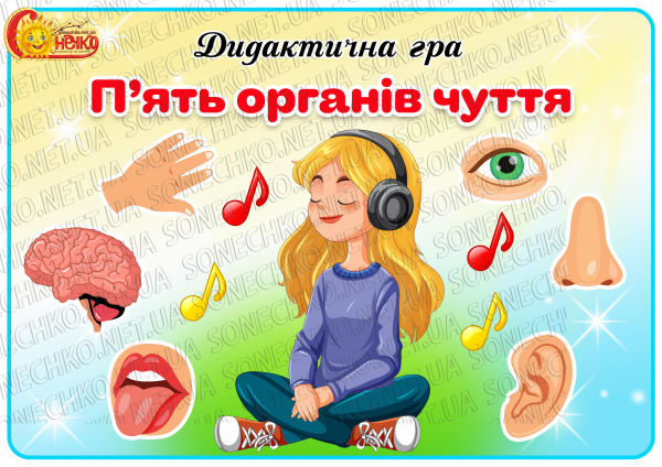 Мета: закріпити знання дітей про органи чуття людини через гру й асоціації; вчити розпізнавати органи чуття (зір, слух, нюх, дотик, смак) та підбирати до них відповідні предмети з повсякденного життя; розвивати сенсорне сприймання, мовлення, мислення, пам’ять, увагу та дрібну моторику під час маніпуляцій з картками; виховувати допитливість, пізнавальний інтерес до власного тіла.