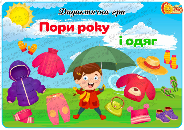 Мета: закріпити знання дітей про назви одягу та пори року; вчити добирати відповідний одяг до кожної пори року, називати його; розвивати увагу, логічне мислення, дрібну моторику рук, мовлення; виховувати охайність і дбайливе ставлення до себе.