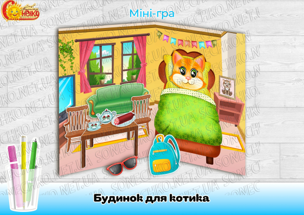 Це міні-книжечка, у якій на титульній сторінці зображено будиночок. Усередині — кімната, яку можна облаштовувати за власним бажанням! На окремих картках є ліжко, стіл, посуд, подушка, ковдра, які кріпляться на липучках. Є милий котик, для якого можна підібрати вбрання та рюкзачок. Дитина може самостійно розставляти меблі, “заправляти” ліжко, одягати котика, вигадувати історії та гратися, розвиваючи уяву, дрібну моторику й мовлення.