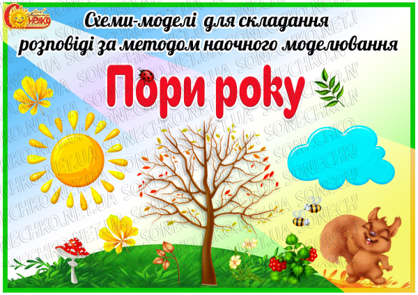 Мета: поглибити знання дітей про пори року; вчити описувати їх, складати розповіді, використовуючи метод наочного моделювання; формувати вміння зв’язно та послідовно висловлювати свою думку, гарно формулювати речення, збагачувати словниковий запас; розвивати зв’язне мовлення, увагу, пам’ять, аналогічне мислення; виховувати зацікавленість, любов до природи, навколишнього світу.
